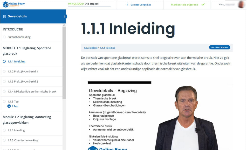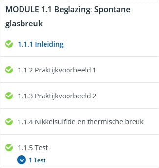 Een cursus is onderverdeeld in modulen, waarin een aantal lessen zijn gebundeld. In onderstaand voorbeeld zie je de module ‘Beglazing: Spontane glasbreuk’.